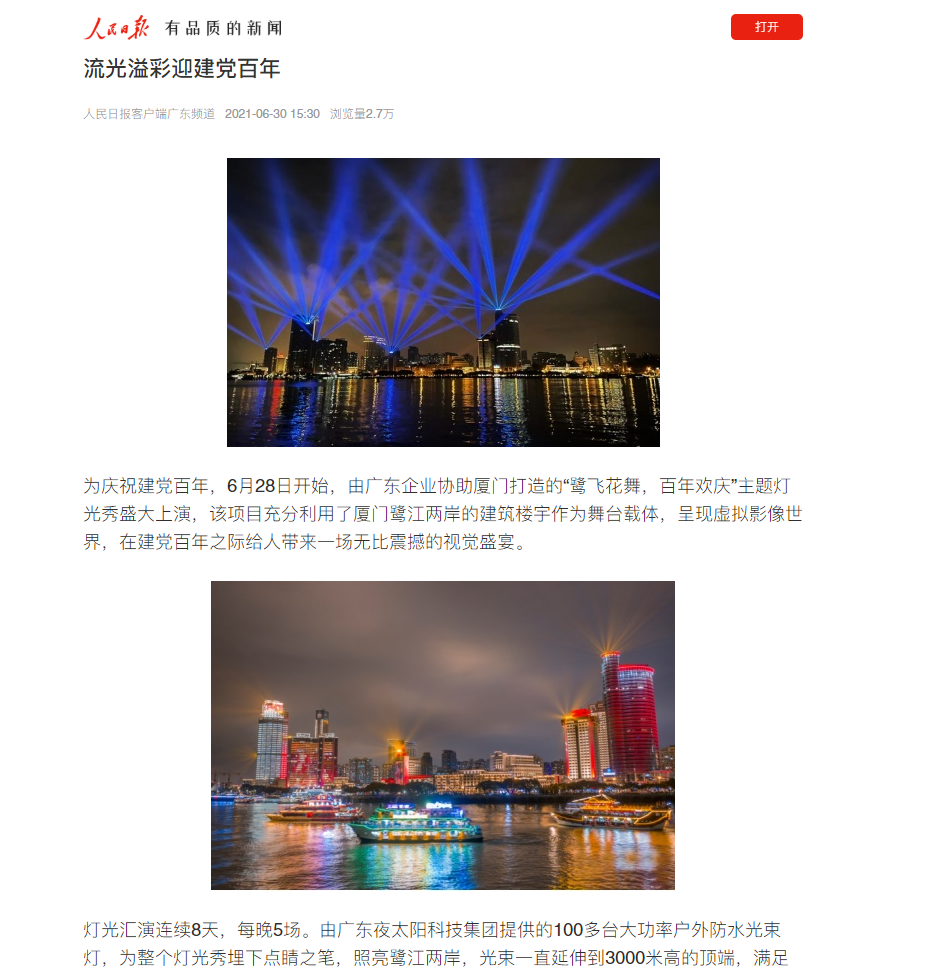 2021年,集團為廈門鼓浪嶼百年黨慶燈光秀“鷺飛花舞,百年歡慶”提供設備和技術支持,人民日報、羊城晚報等黨媒皆有報道,央視13套東方時空有電視新聞報道。